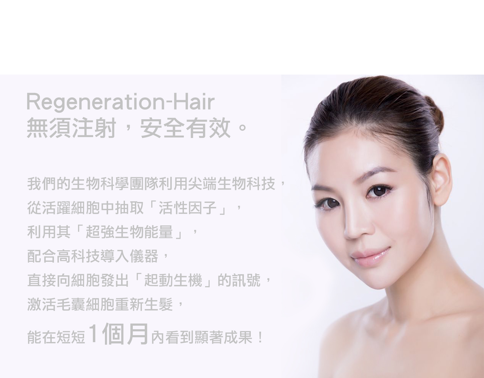 脫髮問題已困擾張女士多年,使張女士曾花費巨款使用不同防脫髮產品或治療項目。但數年來效果反反覆覆,即使長出幼髮,卻又在幾星期後脫落,情況一直未被改善。自從接受Regeneration-Hair的療程,張女士對改善脫髮問題重拾希望,皆因Regeneration-Hair的療程成果絕不反彈,令張女士在2個月內感受到Regeneration-Hair的奇妙之處。